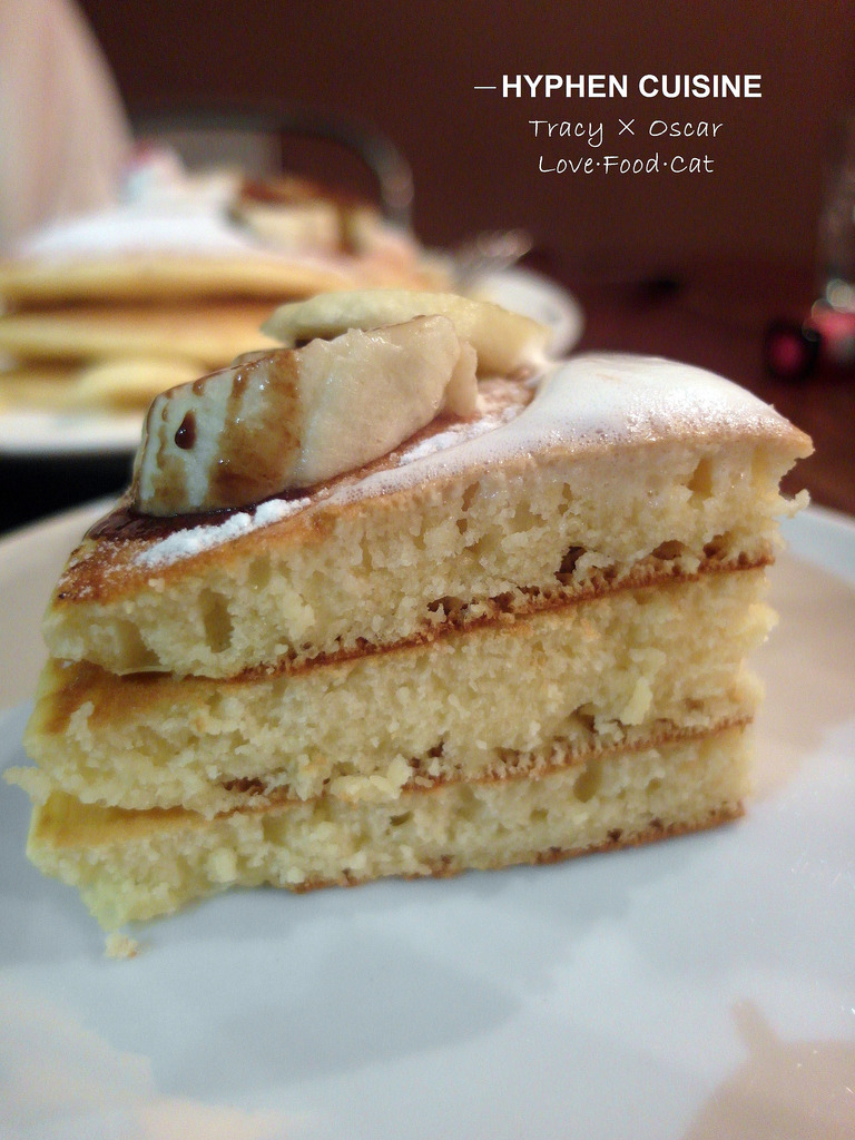 ▲整整有三大片煎餅,旁邊還有幾片香蕉,上頭撒了糖粉、鮮奶油和巧克力醬,以及一旁自行添加的蜂蜜,