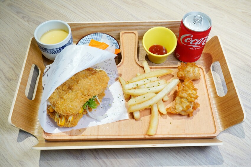 這道「雙倍顎勢力豬排漢堡」真的顛覆了魚編對於一般豬排的想像!豪邁地以兩大塊腰內豬排取代漢堡麵包,套餐裡面還搭配了薯條、唐揚雞、日式蒸蛋、漬物與可樂,西式與日式料理的結合也能如此有創意!