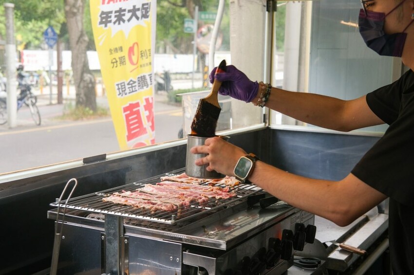 ▼【肉嘞】的餐點都是現點現做出爐,師傅在外面的烤爐上翻烤著肉片,在門口就能聞到超邪惡的香氣。