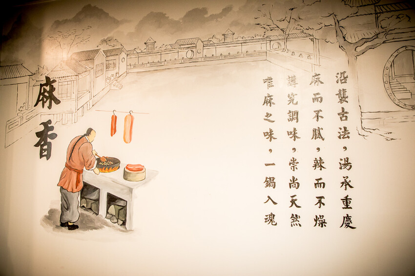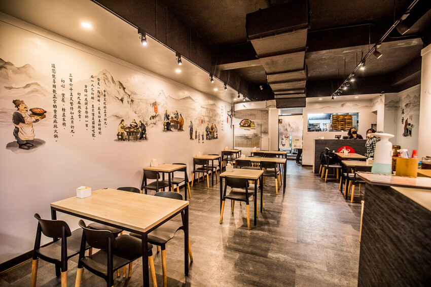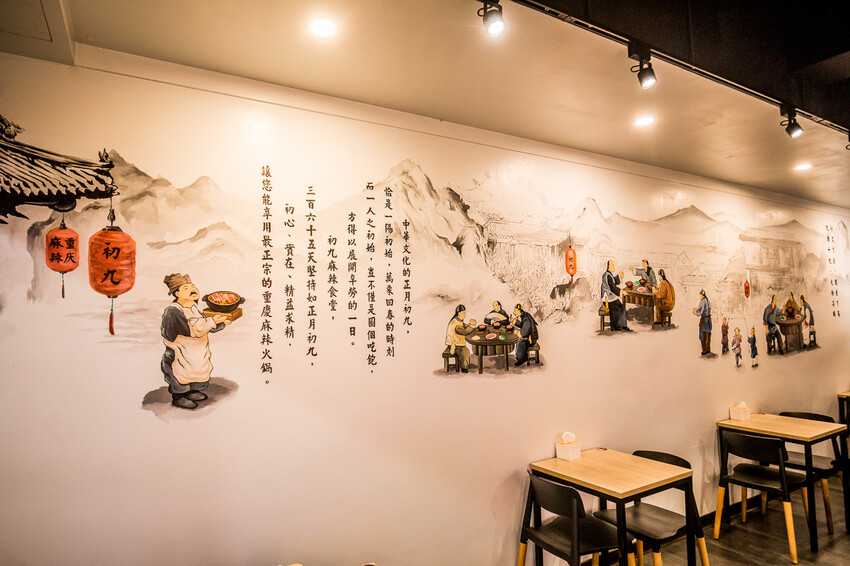 我們來的時候已經快接近打烊的時間,店員們還是很熱心地招呼著,用餐區乾淨又舒適的桌距,雖然已經是用餐離峰時段,但有許多在地人一直上門都是來外帶或外送,外送鈴聲也一直響不停,牆上也有關於初九麻辣食堂的介紹
