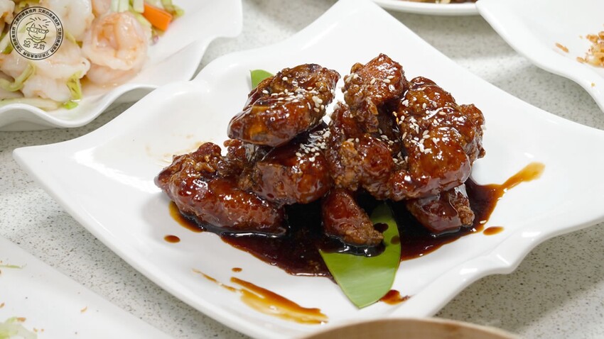 黑醋調出的醬汁酸酸甜甜的味道裹覆在小排上,