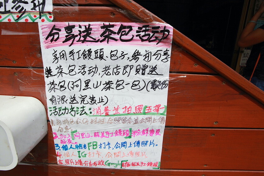 桌面有優惠告示買包子饅頭網路分享送茶包。
