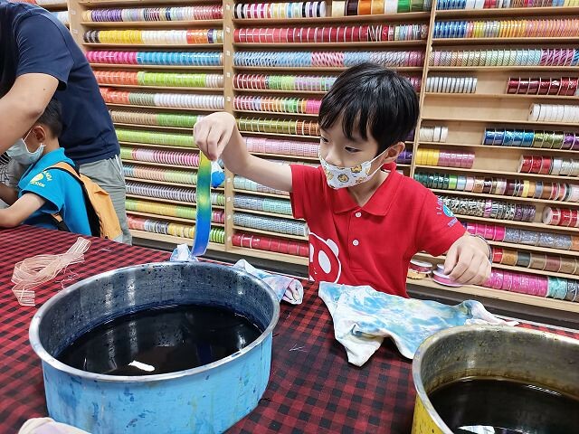 依照自己喜歡的顏色將緞帶浸入染料中,導覽阿伯也會教導漸層顏色的方法。