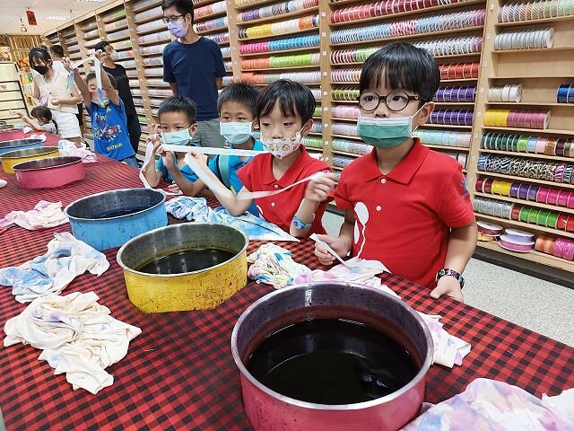 「緞帶王觀光工廠」也規劃了體驗活動,像這個染色體驗是免費體驗的。四個小小孩很期待這個體驗,為了成功完成作品,乖乖聽著導覽阿伯的解說。