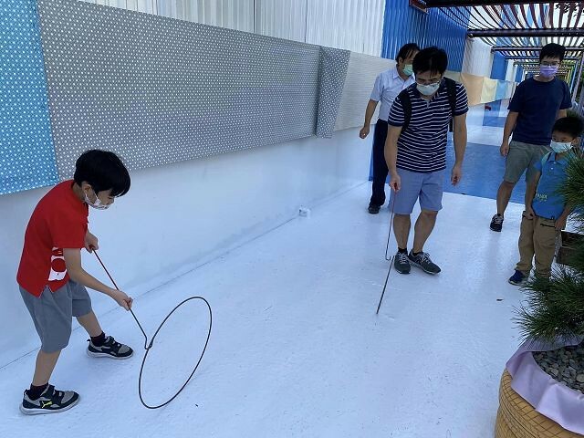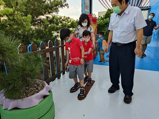 「緞帶王觀光工廠」還規劃了戶外的古早童玩體驗區,光在這一區就讓我們玩了好久。滾鐵環、踩高蹺、雙人木板鞋,小孩們都沒有玩過,覺得很有趣。