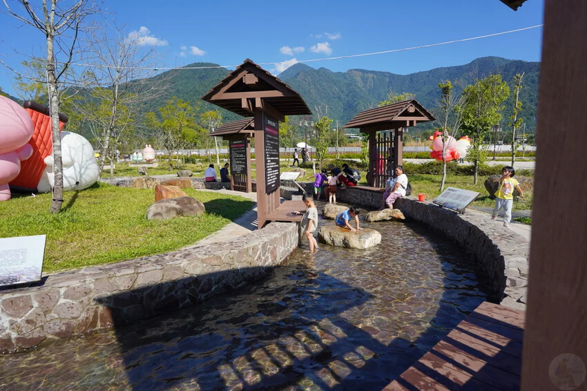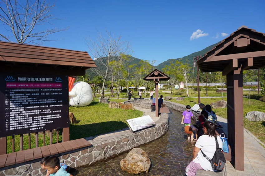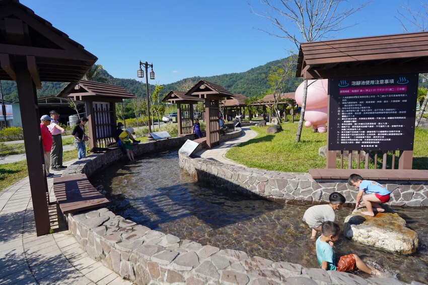 想泡腳嗎?現在不用跑到谷關或宜蘭了,因為除了泰雅原住民文化產業區,福興溫泉區親子公園也有泡腳區了!這裡的溫泉水質是「碳酸氫鹽泉」,被稱為「美人湯」。泡腳渠道旁有仿木造泡腳亭,非常有日式風格,小朋友在這裡跑跑跳跳後可以來泡腳休息一下喔!當然,小朋友在遊戲區玩耍的同時,大人也可以來泡腳放鬆一下!