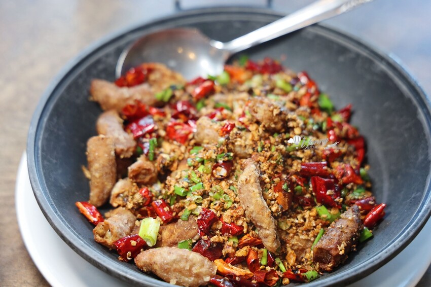 看起來紅通通的,但其實不會太辣,以牛腸入菜,吃得出干鍋特有的香氣,滿滿的蒜香,超級下飯。