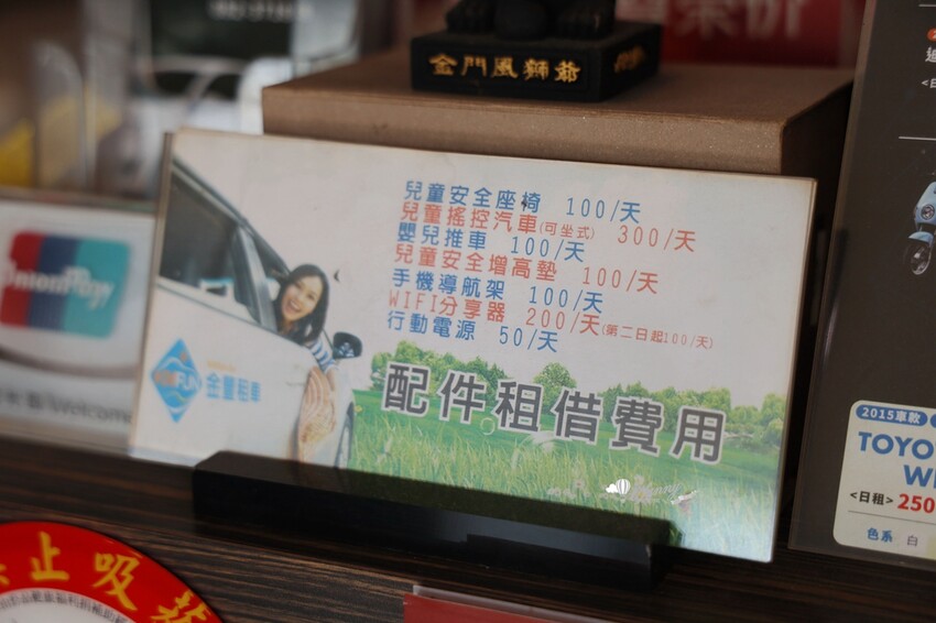 進到營業所後,可以發現有許多配件,是可以另外租借的,像是兒童安全座椅、嬰兒推車等。價目表也是清清楚楚,就算忘了帶行動電源,金豐租車都有。