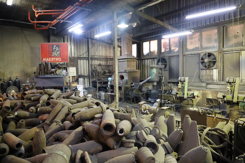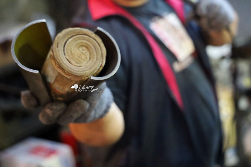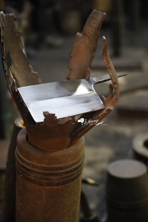 導覽老師戴起了麥克風,告訴我們製刀用的砲彈大多是宣傳彈,當時的宣傳彈僅填充少許的火藥,火藥會將保護文宣品的鋼片從砲彈底部推出,因此彈殼保存完整,就是鍛造鋼刀的最要材料。