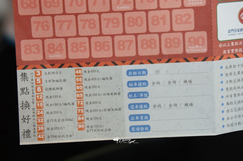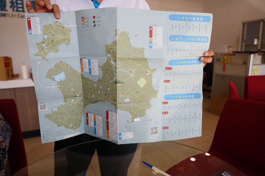租車手續辦完之後,金豐租車更是送上一張金門的地圖,介紹了金門好吃好玩的景點美食,還有不同天數的旅程規劃建議,真的超貼心的。