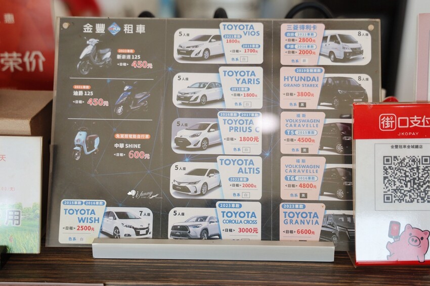 金豐租車提供各式汽機車,以及不須駕照的電動車租賃服務。除了官網之外,現場也有清楚的價格表,以及車種款式。公開透明的價格,不用擔心受騙被坑錢,安全有保障。