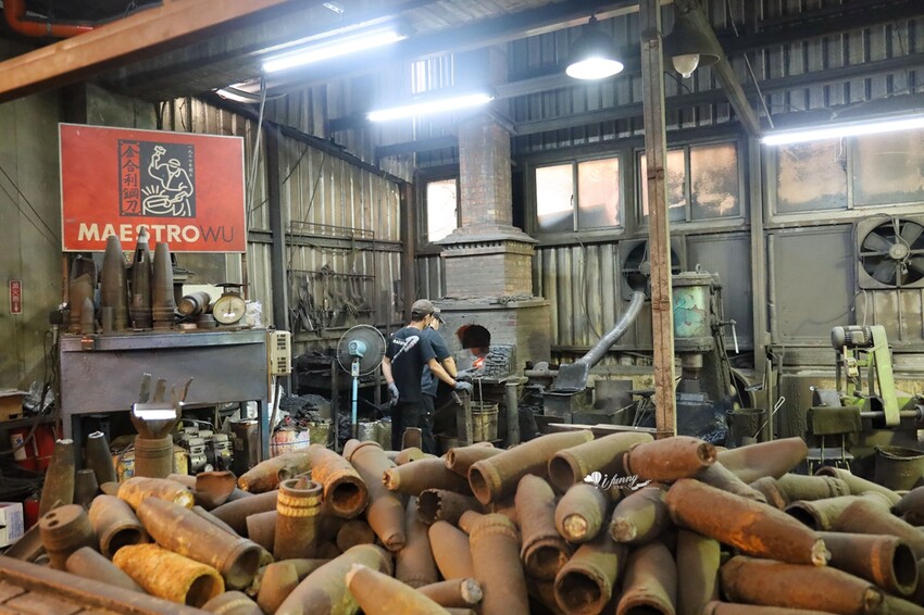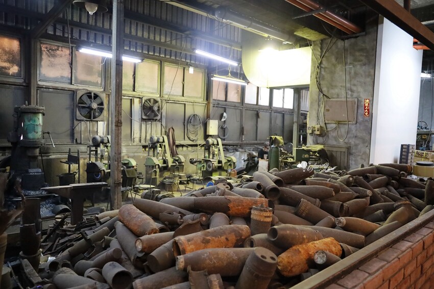 導覽老師戴起了麥克風,告訴我們製刀用的砲彈大多是宣傳彈,當時的宣傳彈僅填充少許的火藥,火藥會將保護文宣品的鋼片從砲彈底部推出,因此彈殼保存完整,就是鍛造鋼刀的最要材料。