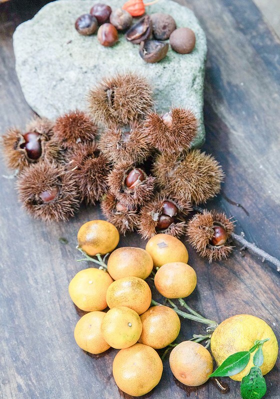 門口放著迎賓般的田樂蒟篛,小橘子、粟子都是免費自取,一片農家樂的模樣。