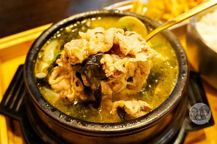 韓式海鮮牛肉海帶湯定食有主食一份、白飯一碗、三樣小菜和一杯麥茶,