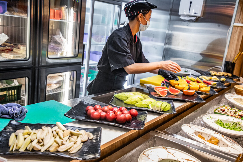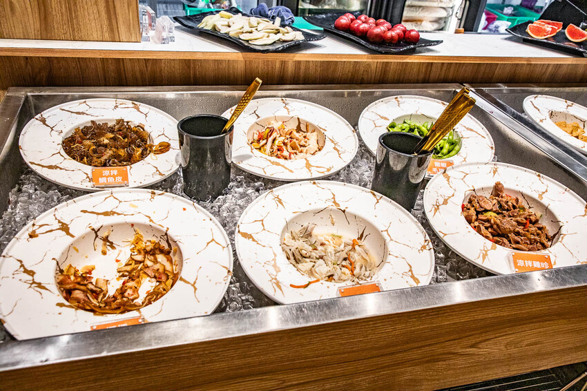 生菜沙拉、涼拌小菜區,各種生菜沙拉、涼拌小食、燙白蝦、水果等等都是吃到飽,自助吧後面就是廚房,可以看到廚師在料理,做好就直接送上自助吧,因為廚師直接會看到自助吧,已經快拿完的東西會邊做邊補上,所以新鮮度會比一般自助吧要好很多