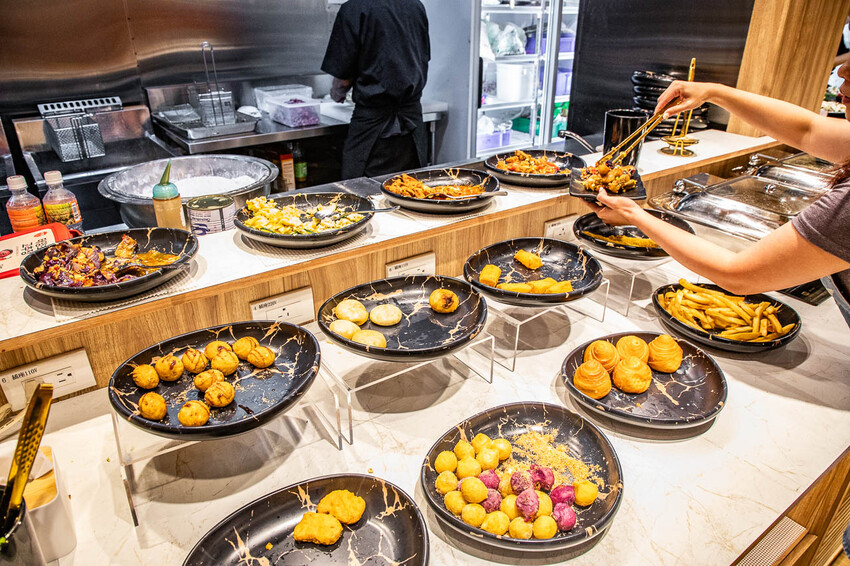 炸物熱炒區,也是很受歡迎的區域,有各式炸物薯條、雞塊、柳葉魚等等,泰式、台式熱炒,這裡竟然還有台味十足的鹽酥雞呢,而且不定時也會更換菜色,每次來都不無聊
