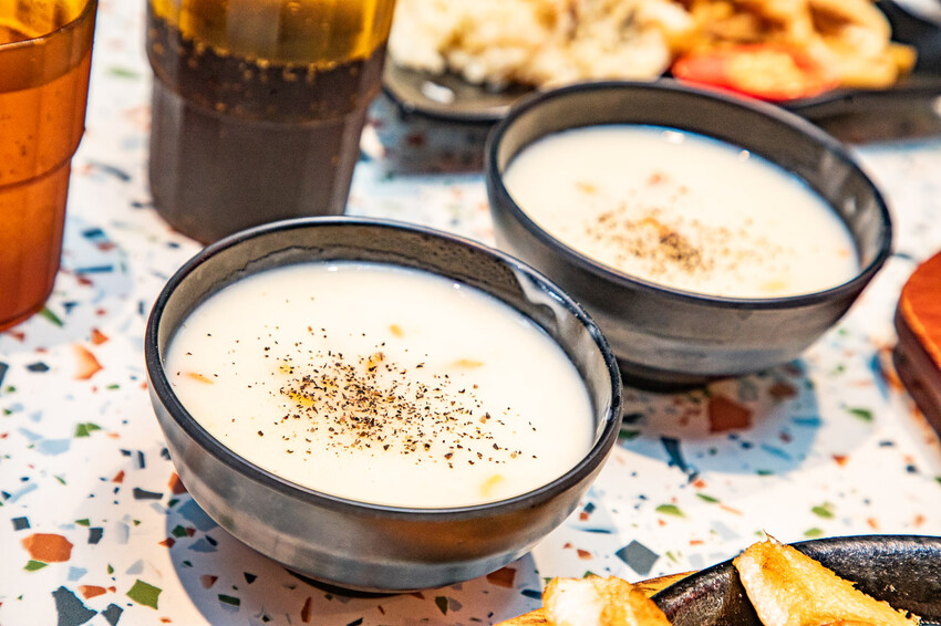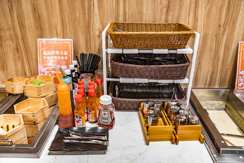 玉米濃湯(湯品不定時更換)、黑胡椒醬、蘑菇醬,黑胡椒醬、蘑菇醬都是夯尼自製的,吃起來相當夠味,玉米濃湯濃稠度適宜,充滿濃濃奶香跟玉米、火腿丁等配料,搭配牛排好良伴,還有一些牛排醬料也是擺在這區