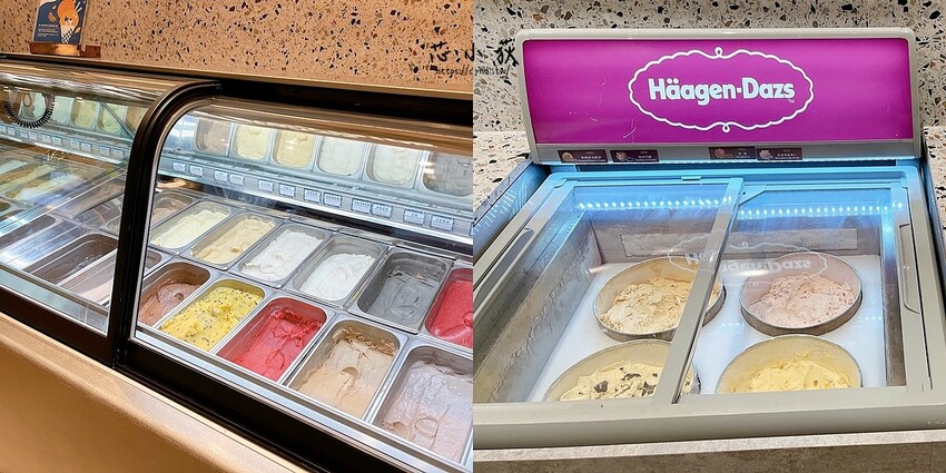 冰淇淋區提供哈根達斯冰淇淋等口味眾多,紅豆、芝麻燕麥、香草、香蕉娜娜、花生粒粒、巧克力、燕麥拿鐵、百香果雪酪、蜂蜜檸檬雪酪、草莓雪酪、芝麻、太妃奶茶…,這櫃的冰淇淋味道比較濃郁,而且口味也很特別少見;哈根達斯冰淇淋有焦糖奶油脆餅、淇淋巧酥、草莓、夏威夷脆果仁,提供甜筒餅乾。