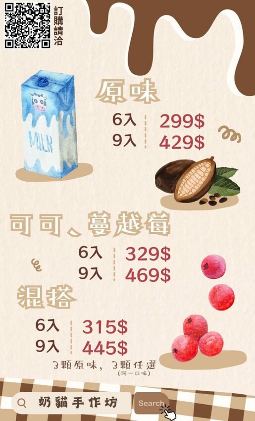 【奶貓手作坊】提供線上購買的服務,目前有原味、可可和蔓越莓三款口味,可私訊店家臉書詢問購買細節。
