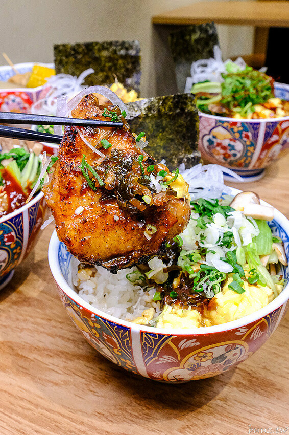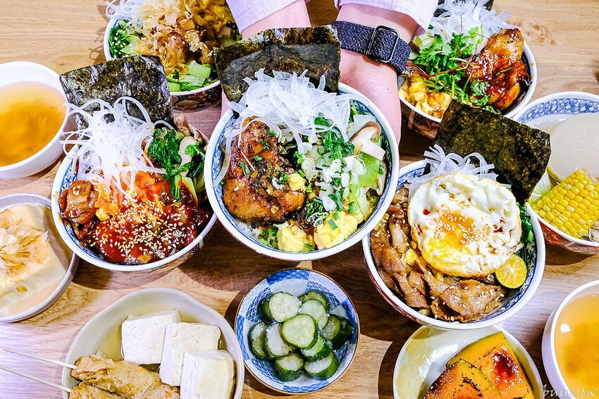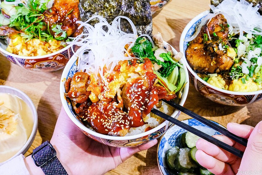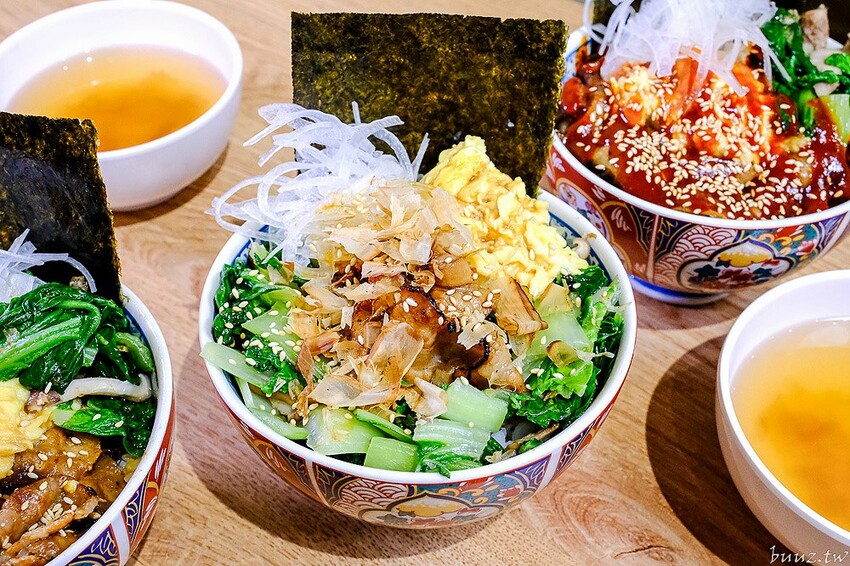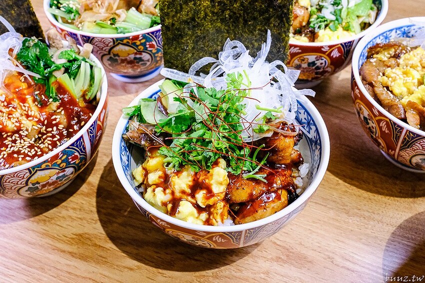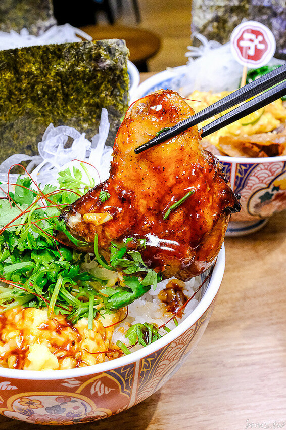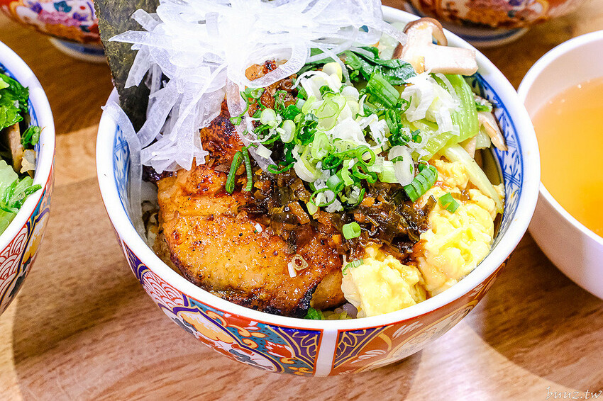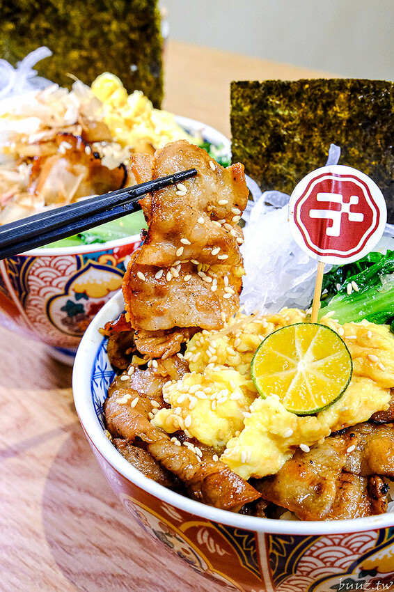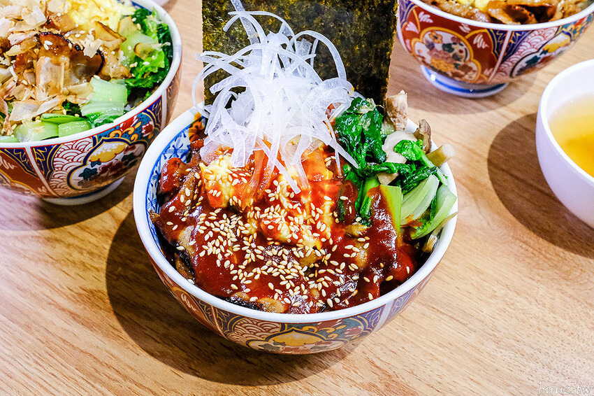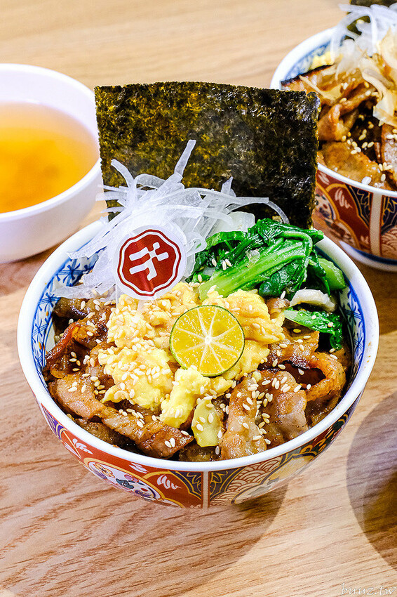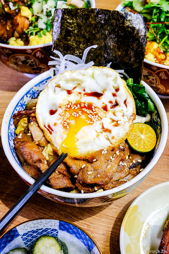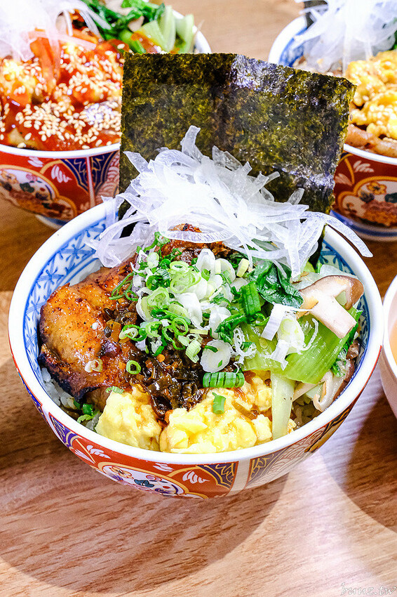這碗招牌「醬烤燒豚飯」是以台灣豬五花肉片用炙烤日式醬燒的方式處理,再搭配蔬菜、滑蛋、洋蔥絲跟海苔片,同時也是店內人氣NO.1丼飯口味。