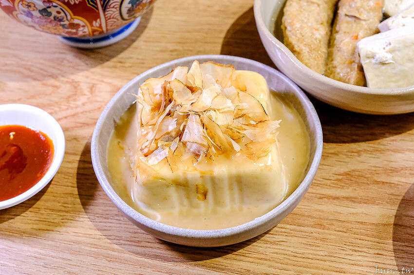 白豆腐選用的不是嫩豆腐,而是市場直送的板豆腐,吃起來口感較為扎實有明顯豆香,沾點關東煮醬也很搭。
