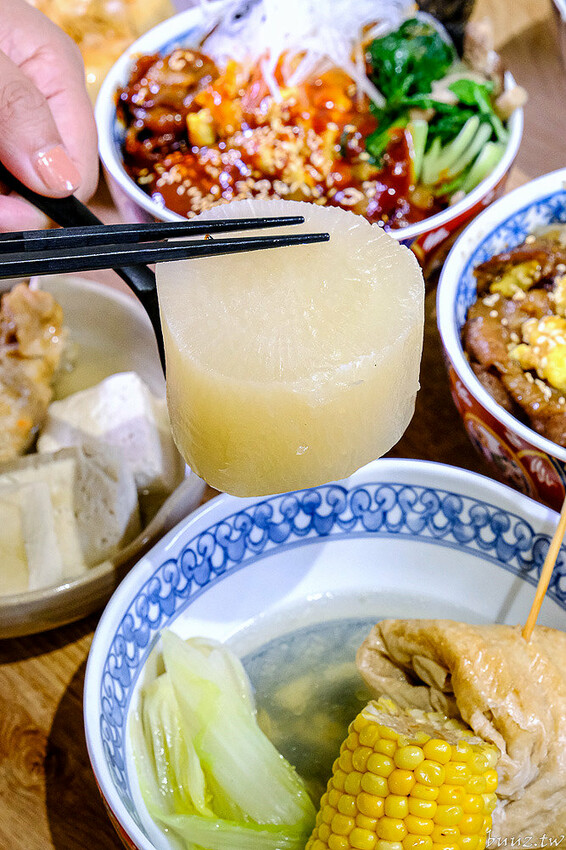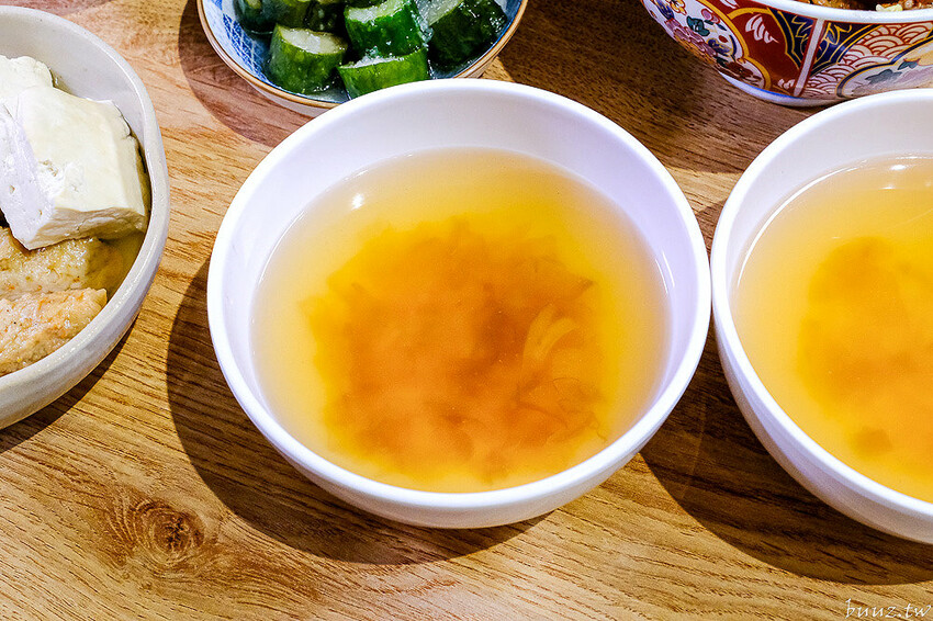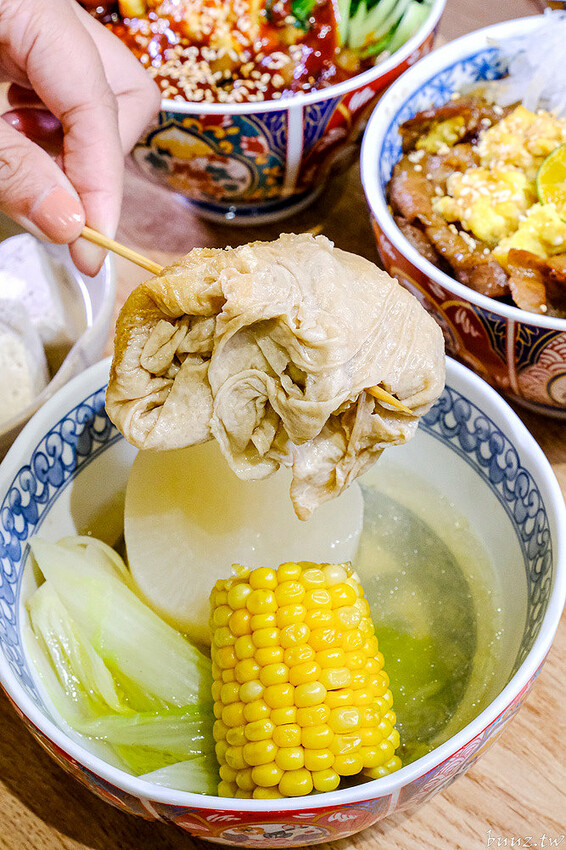 關東煮湯頭是用柴魚跟洋蔥熬煮,滋味比較清甜清爽適合配丼飯吃,這天吃到的有白蘿蔔、娃娃菜、玉米、豆皮、白豆腐跟黑輪。