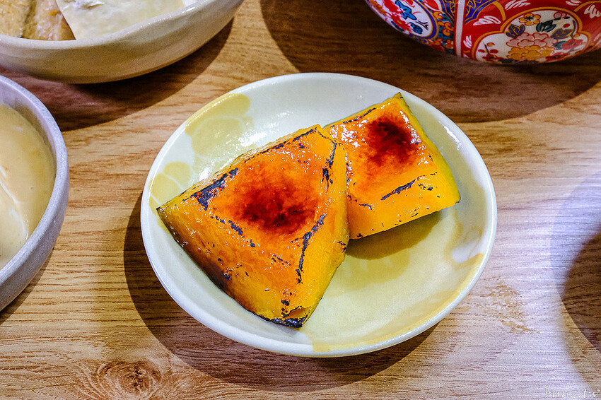 再來這一款焦糖南瓜我個人很推薦,他們會將蒸透的大塊南瓜搭配焦糖炙烤過,上桌時會看到邊邊微焦的模樣還有一層脆脆薄薄的焦糖。