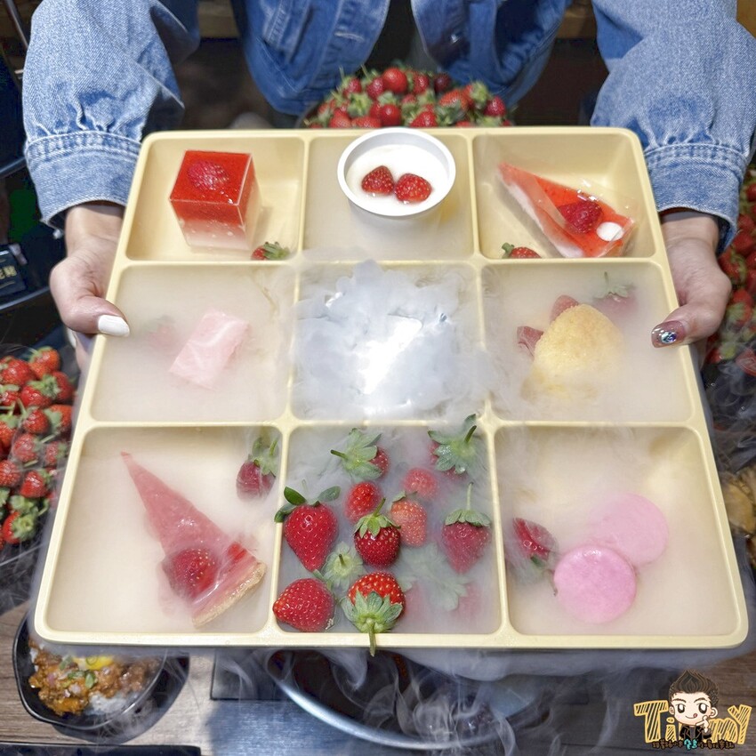每桌會先送上九宮格草莓甜點,搭配著乾冰出場真的很夢幻,草莓控快衝一波吧