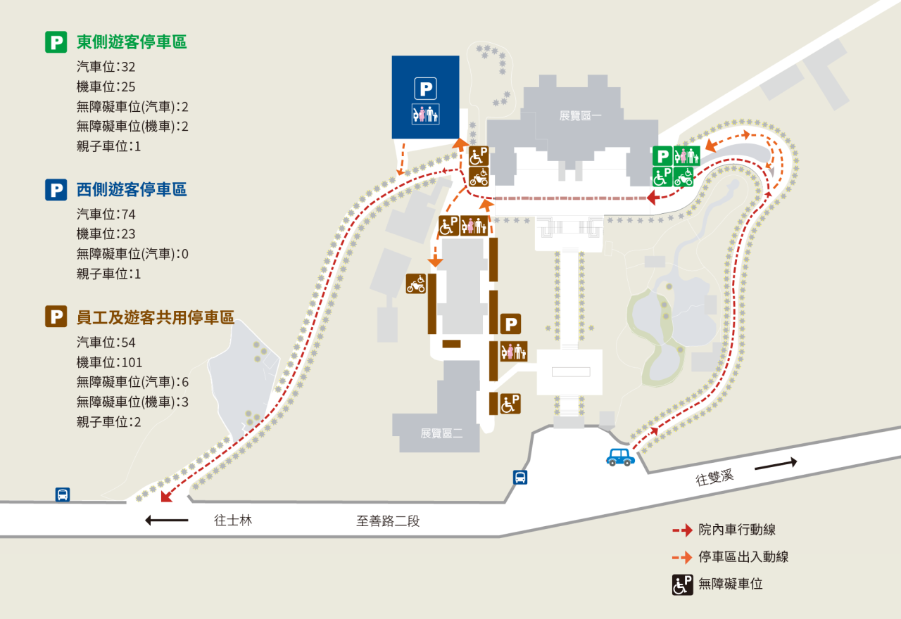 | 員工及遊客共用停車場 | 汽車位:54 機車位:101 無障礙車位:6 親子車位:2 | ||