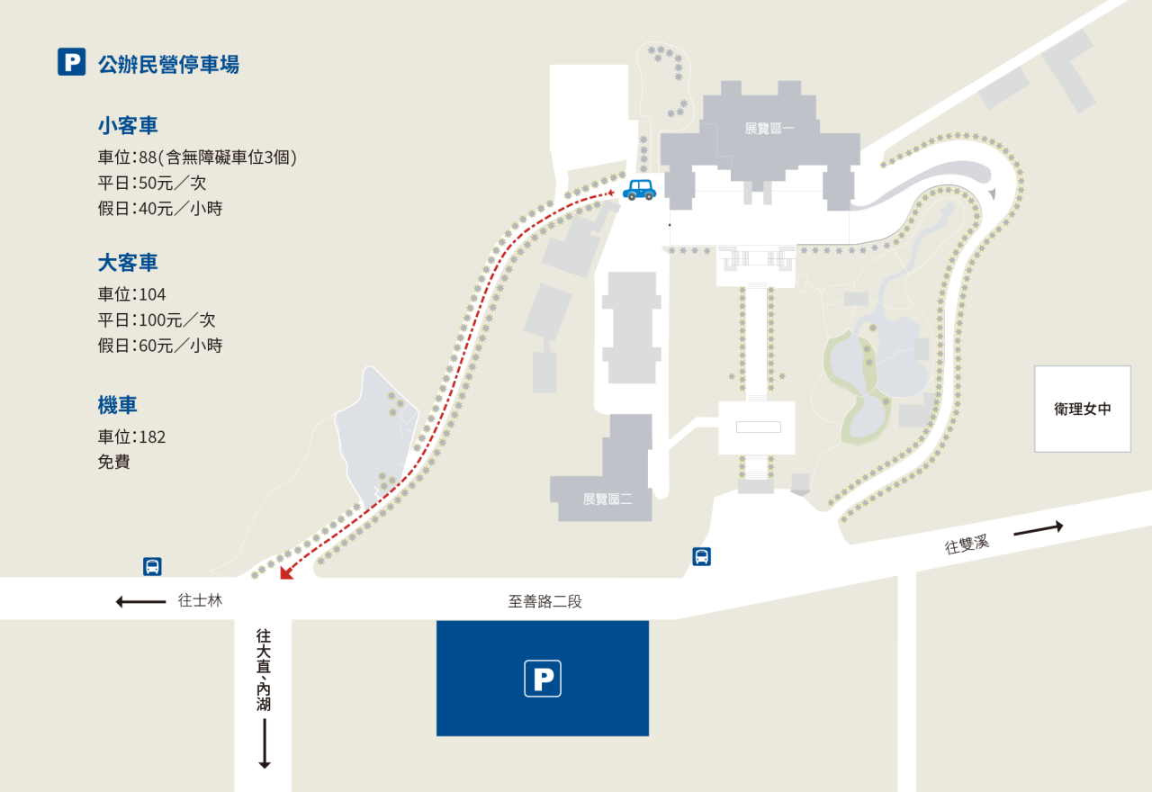| 故宮公辦民營停車場 | 台北市士林區至善路二段150號 | 平日每次50元;例假日每小時40元 | 24小時營業 大型車平日100/次、例假日60/時 |
