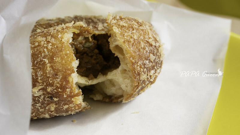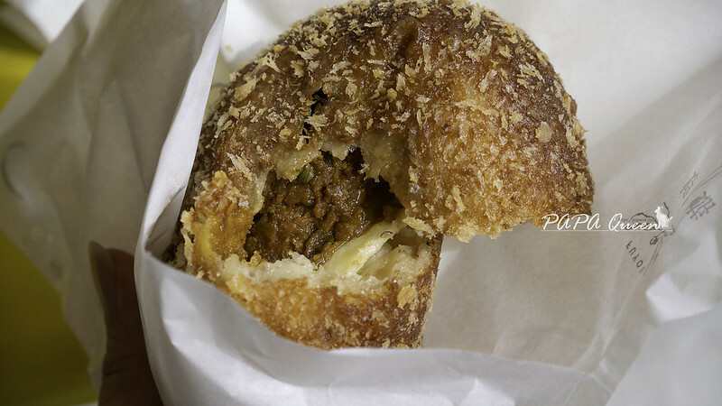 粗曠麵包粉沾裹表面後油炸變成金黃酥脆的口感,紙袋外註明著牛豬雞三種口味,所以不用擔心會搞混,除非你自己拿出來又亂放….