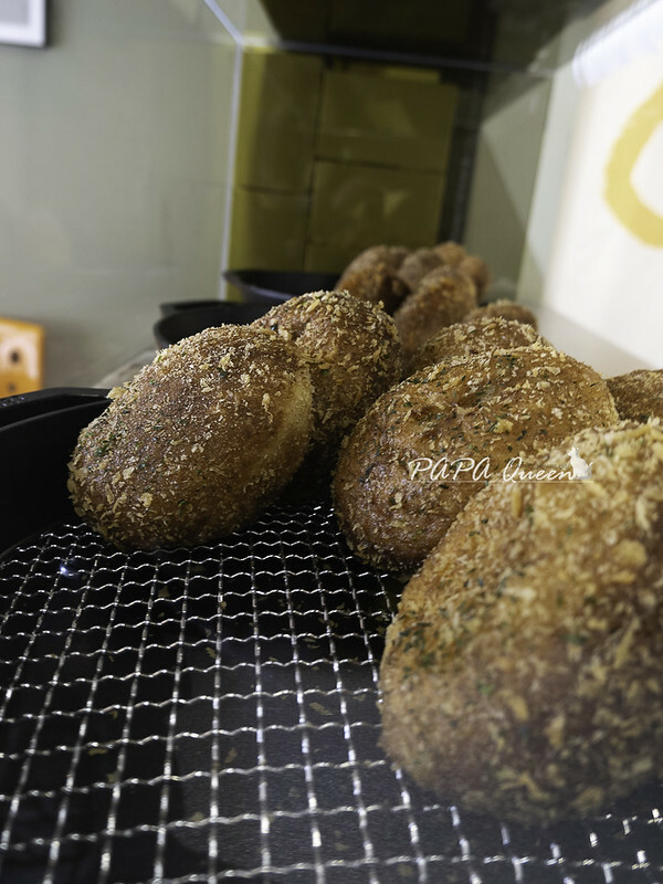 櫥窗內三種麵包看起來都差不多,簡單用海苔 紅辣椒粉之類的區別,每一顆都會獨立包裝,麵包還有熱熱的溫度略燙,但不燙手