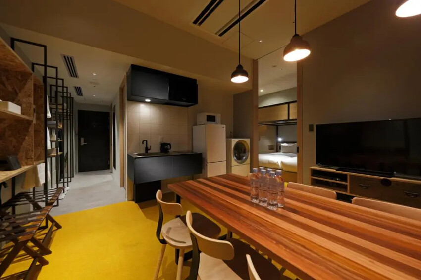 這間新宿住宿門口以紅磚外牆打造復古時尚的建築風格,內部建設以黃色調光線打造溫馨的入住氛圍。館內設有3間餐廳,西班牙料理,BAKERY美味麵包、義式料理與燒烤。服務項目則提供自助使用的微波爐、洗衣房。