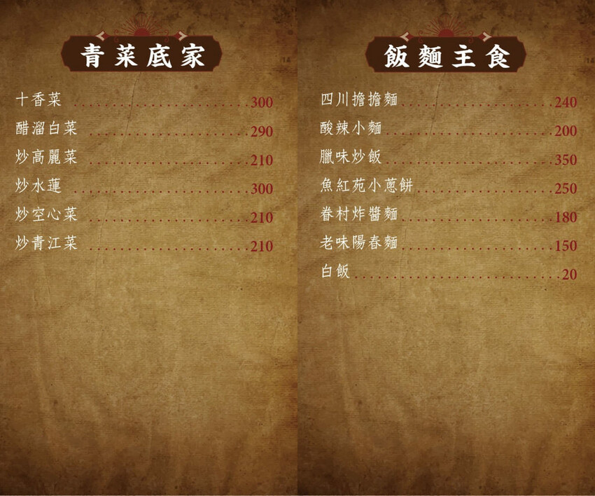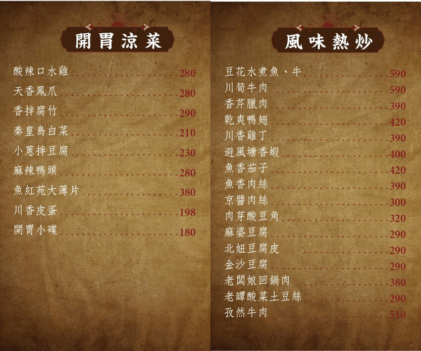 提供菜單給大家參考,這裡的料理選擇不少,老闆據說有一半的四川血統,所以這裡的口味都是正宗地道的四川重慶口味,來這必點的重慶烤魚還有其他的風味熱炒料理,都是口味頗具特色,平常較少有機會吃到的特色菜。
