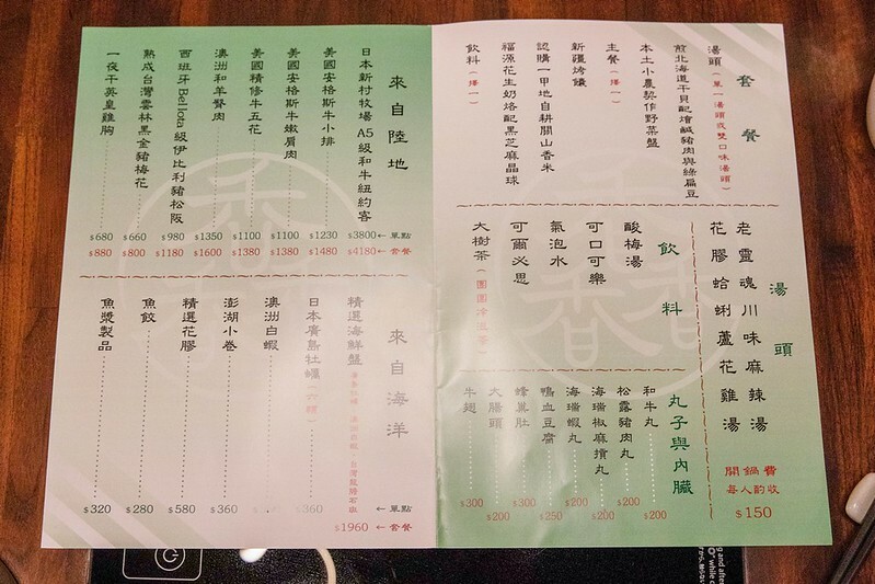 所謂的套餐就是一個人的低消含湯底的費用,開鍋費是150元/人,火鍋料大致上分肉、海鮮、菜盤、丸子和內臟,價位上以私廚來說算是相對公道。