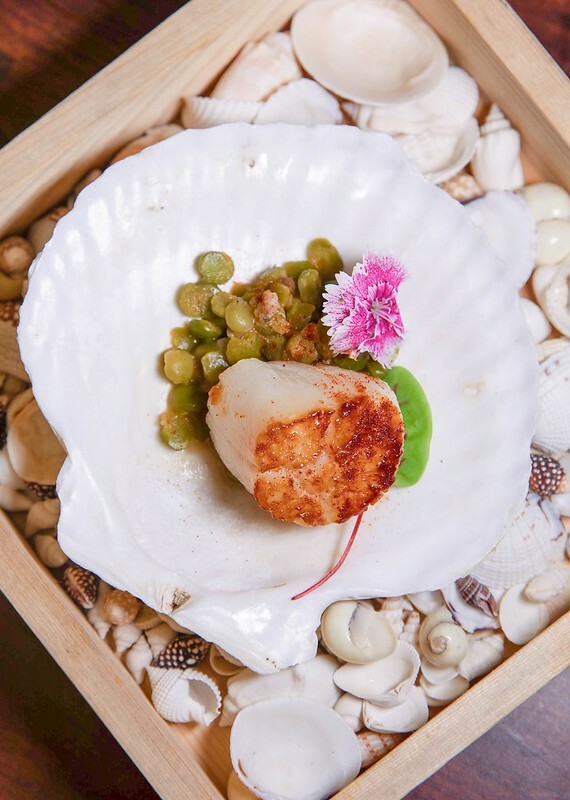 接著上場的是第二道前菜,是的,吃個火鍋有兩道前菜,會不會太浮誇,而且同樣擺盤很用心。煎北海道干貝,感覺只是灑了一點點微鹽的調味,有一點像在吃鐵板燒,微焦香帶著入口炸烈的干貝鮮,搭配了一點鹹豬肉燴綠扁豆。