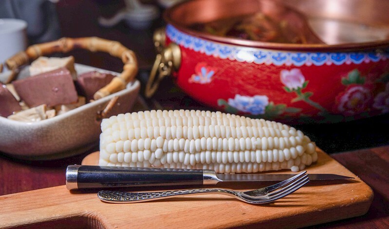 如果你跟我一樣喜歡牛油香重一點的麻辣鍋,這裡也提供了牛油可以添加,對,這個玉米其實就是牛油...附上刀叉,可以自行決定加入的牛油量。有意思吧xd