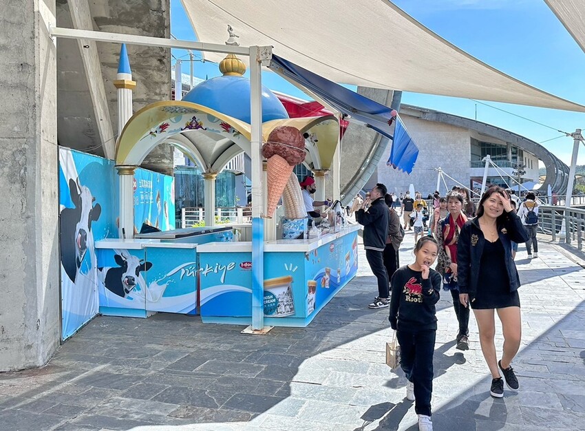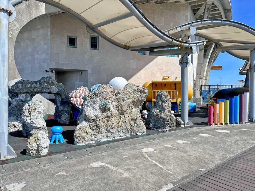 珊瑚王國館以及台灣水域館參觀後,要到世界水域館就需要步行走出戶外喔!沿途有設置不少小吃攤,有販售冰淇淋、飲品等等,戶外也有一裝置藝術可以拍照打卡。