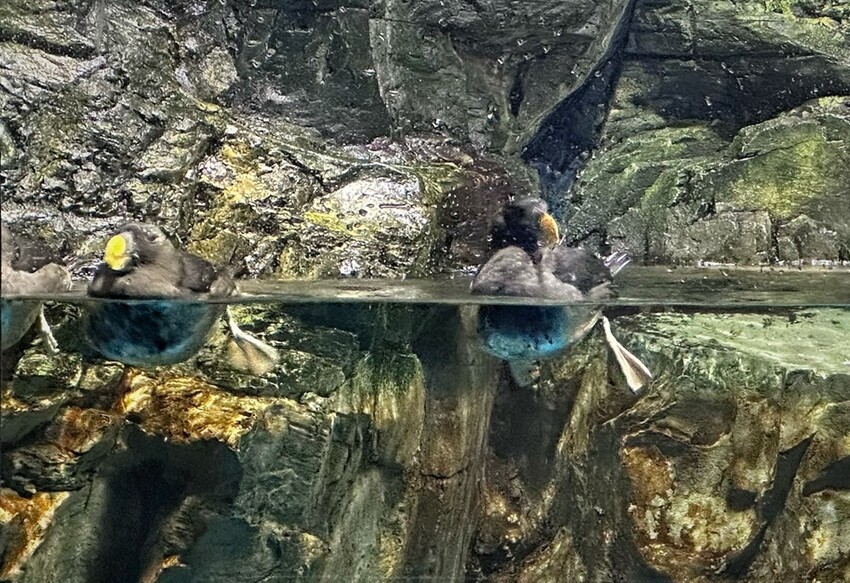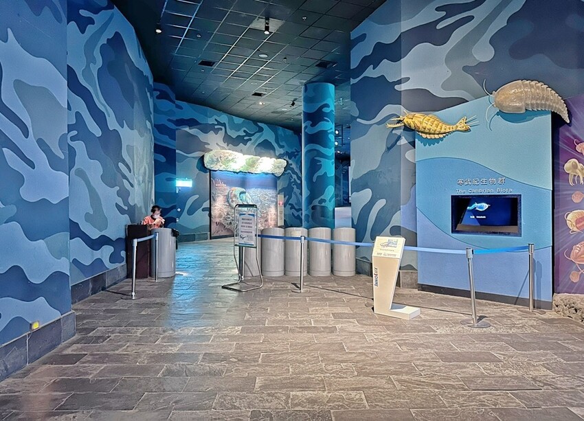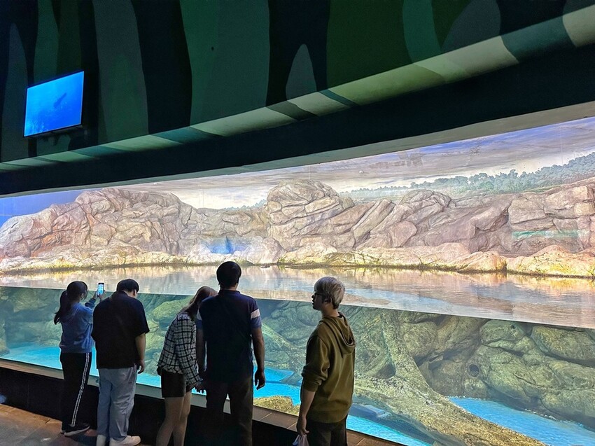 世界水域館內會讓人覺得比較昏暗且冷一些,順著參觀方向,會建議走上2樓再依序下樓參觀。整個館區主要是以時空探查艇遨遊海域的呈現方式,讓大家能感受遠古時期的海洋、巨大的海藻森林以及深不可測的深海水域及寒冷的極地水域。