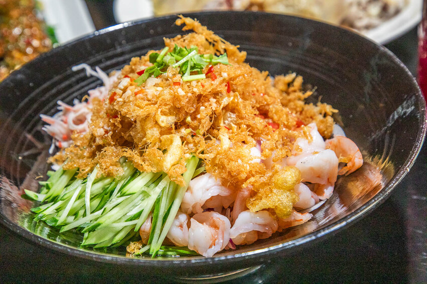泰式涼拌蝦仁沙拉,蛋酥、小黃瓜、香菜、蝦仁、番茄、洋蔥絲還有蟹肉棒絲,已經調好味了,上桌記得先攪拌均勻即可食用,層層堆疊的口感風味,夏天吃這一道真是開胃
