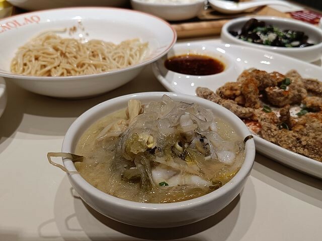 「姥姥酸菜魚」的菜單,不太會有選擇障礙,喜歡吃辣的的就點「姥姥酸菜魚」,不吃辣的可以點「白湯酸菜魚」。有單人獨享餐,也有多人共享的大份量選擇;另外還有一些特色小點。