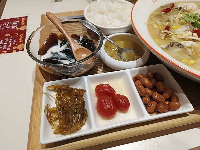 我們點了一份單人獨享餐,內容有酸菜魚、白飯、三份小菜、一份甜點。以個人套餐而言,這樣的份量算不少呢!