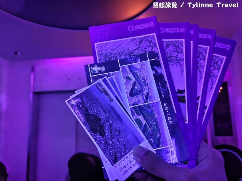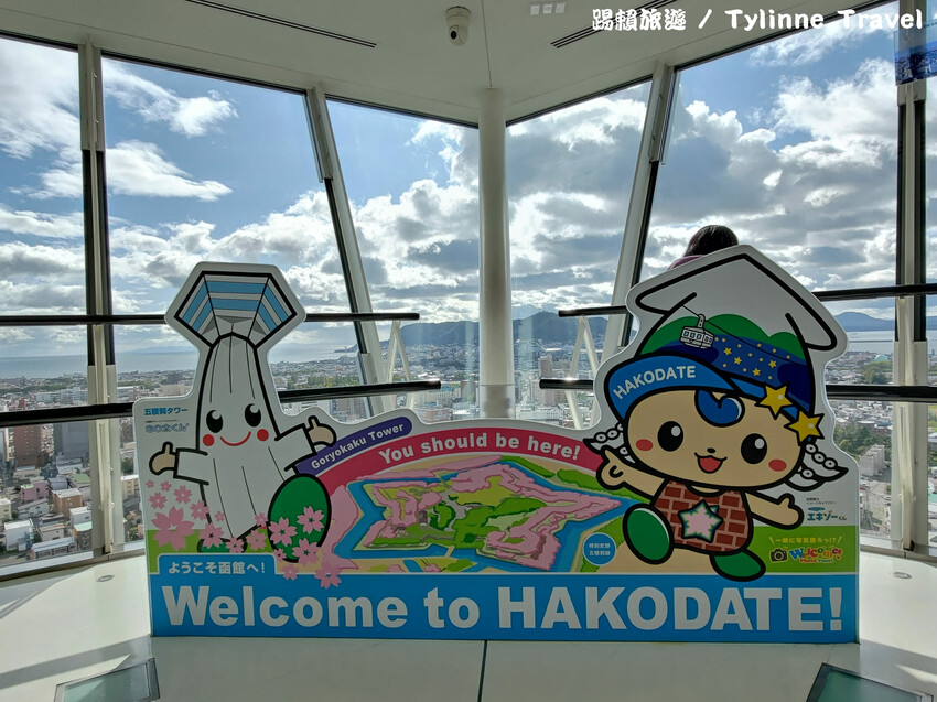 其中一邊的角落有歡迎招牌,這也是五稜郭塔一個適合拍照打卡的位置,陽光灑進來外面的景色非常漂亮
