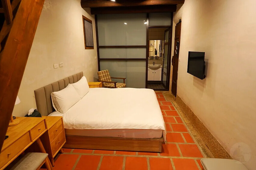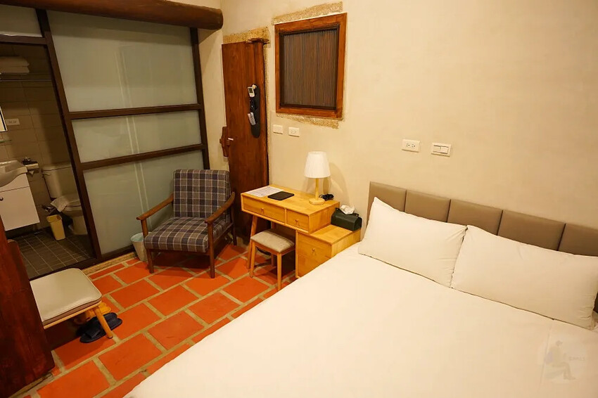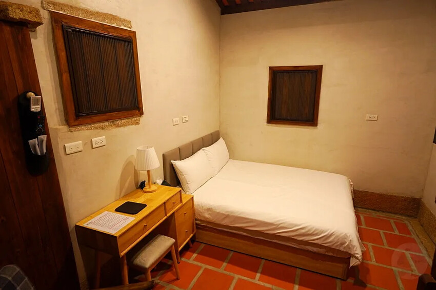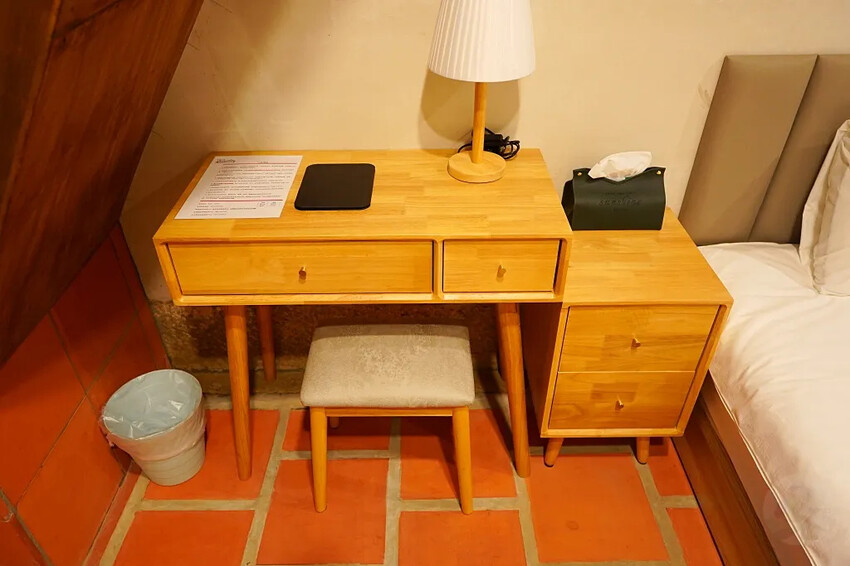 即便是古厝,完全不會感到不方便,反而融合了現代與古早的風格。房內有一張漂亮的原木書桌,上面擺放著小檯燈和鏡子,如果在外出門工作,這張桌子真的非常適合喔!