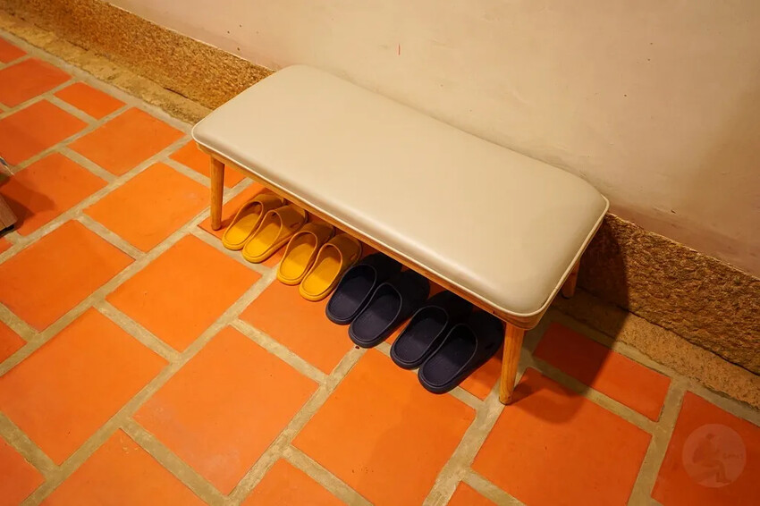 房間裡有提供四雙室內拖鞋,還有一張小板凳,可以坐在上面穿鞋子。而且,這些板凳還有一個特別的功用,可以方便地把行李放在上面,方便整理行李!