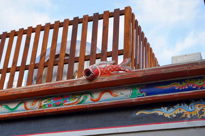 這裡有個超有趣的地方!你可以留意到屋簷上有四隻可愛的鯉魚,原來那是排水孔哦!下雨時,水會從鯉魚口中流出,覺得好巧妙呀。而且,還蘊含了年年有餘、鯉躍龍門的吉祥意義,真的感覺超有意思的耶!