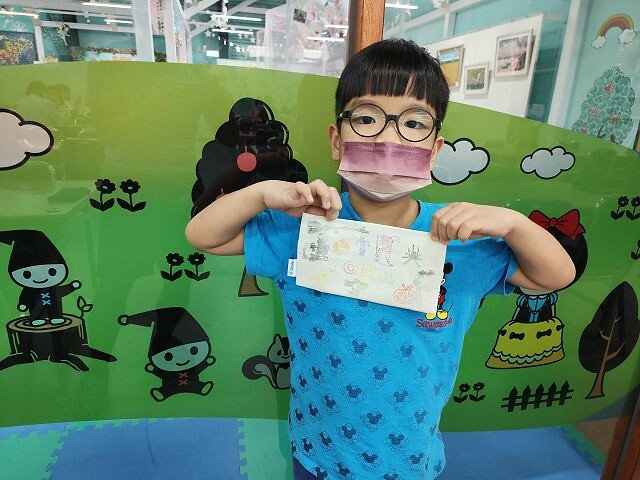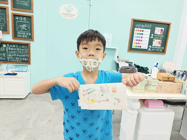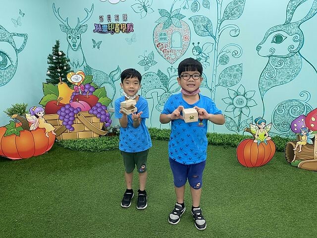 佐佑完成了筆袋和寶物盒的作品,非常有成就感,開心地和作品合照。