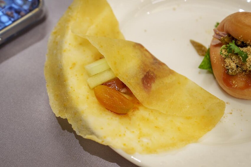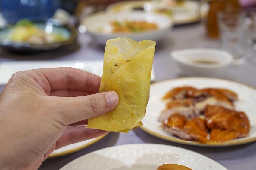 金棗片皮鴨捲:手工自製金棗餅皮帶有厚重的口感,片皮鴨卷裡頭包有小黃瓜、哈密瓜、甜麵醬以及蜜金棗,口感層次豐富