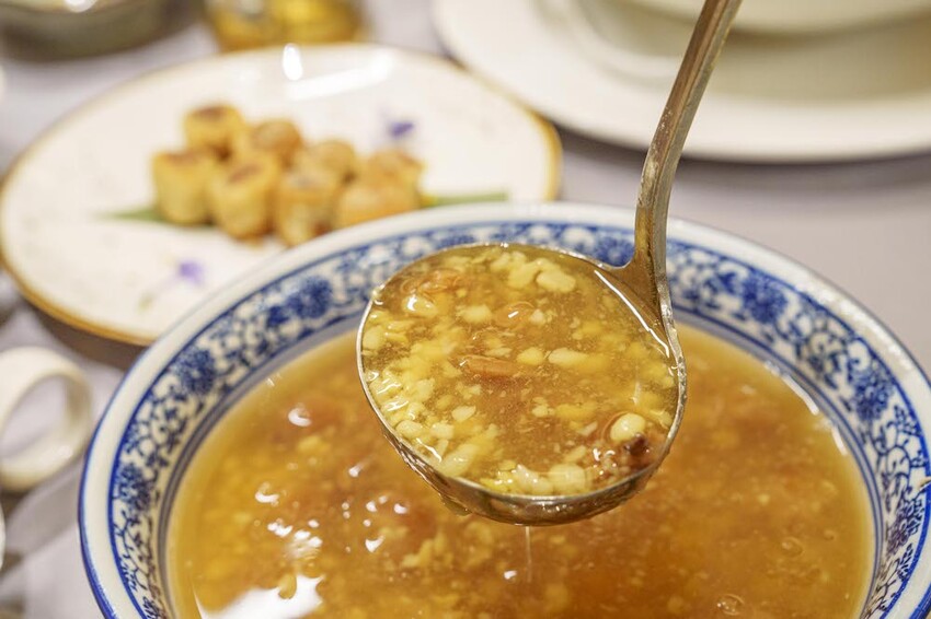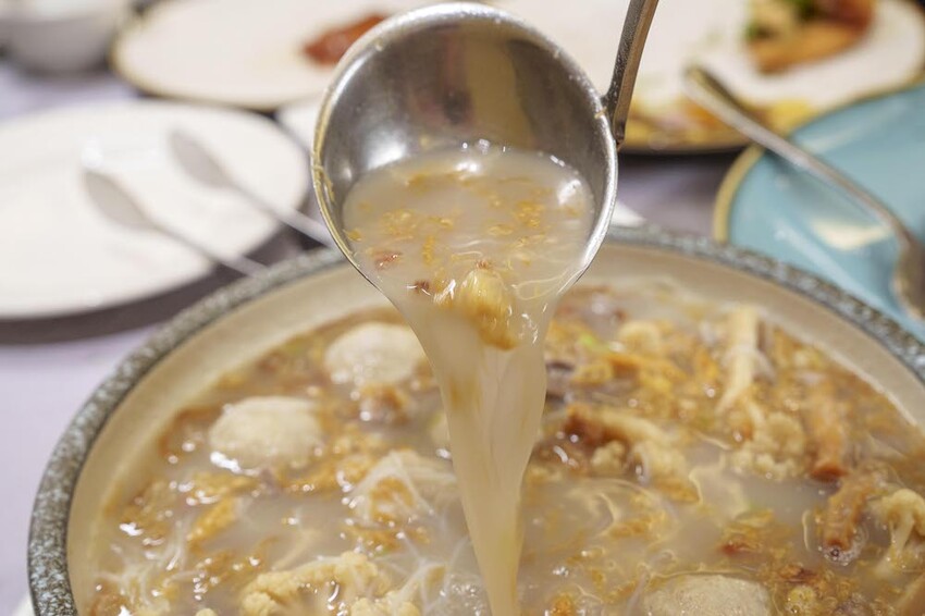 最後加入炸蛋酥以及細米粉,米粉吸收了湯汁精華