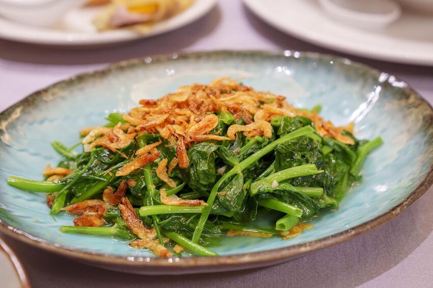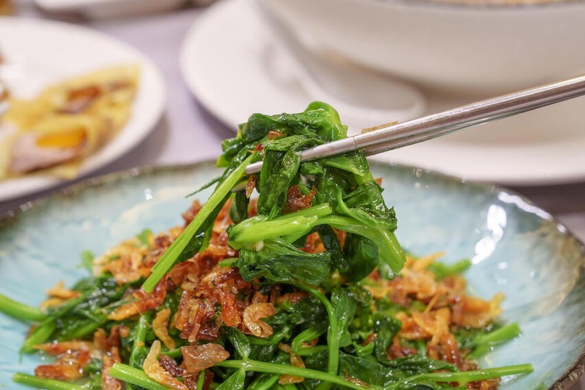豆苗淋上櫻花蝦鴨油,脆口豆苗口感多了一份香氣